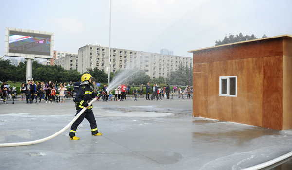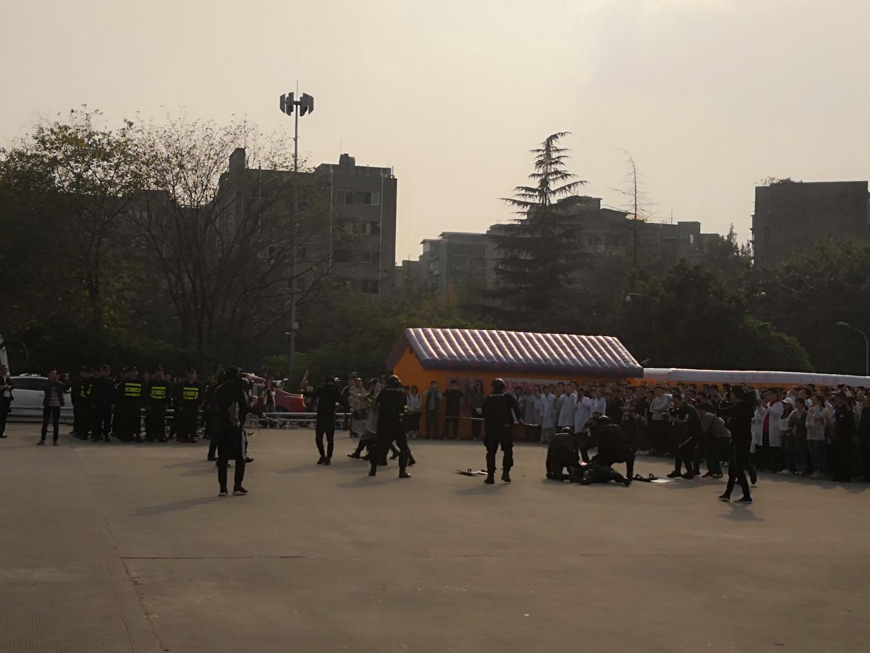 本次校园安全应急演练分为校园突发事件演练、实验室火灾模拟演练和模拟逃生及灭火器使用技能培训三部份。第一部分首先由36名保卫处勤务大队110巡逻队员进行警棍盾牌术的汇演,队员们以整齐划一的动作、精神饱满的表演得到了现场广大师生的热烈掌声。接着校园突发事件演练正式开始:5名放学的学生在体育中心广场被2名形迹可疑的男子尾随并砍杀,2名学生受伤倒地,在双方搏斗中,1名同学趁乱拨打了校保卫处电话,保卫处110巡逻队员、武侯区公安分局“飞鹰”突击队和校医院医护人员先后赶到现场处置,很快“歹徒”被制服,5名学生得以获救。第二部分是实验室火灾模拟演练。某实验室烟雾报警器检测到高浓度烟雾,响起刺耳的警报声,实验室人员迅速拿起灭火器进行灭火操作,随后向学校保卫处、119消防指挥中心报警。在校保卫处和成都消防支队第11中队消防官兵协力奋战下,大火被成功扑灭。此次演练,配合讲解,生动形象地呈现了校园自防自救的安全措施和求助流程。