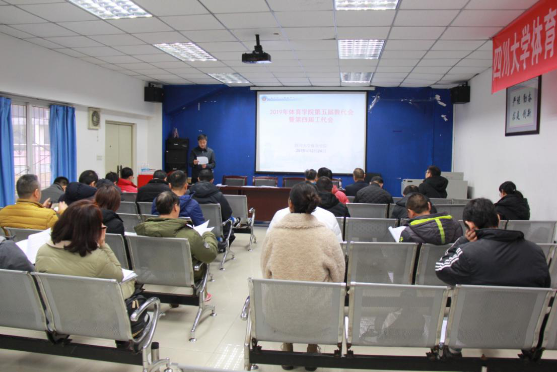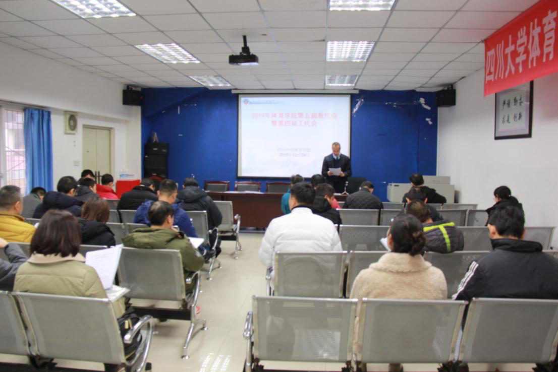 太阳成集团tyc122cc第四届教代会暨第三届工代会第三次会议于2019年12月24日在体育学院胜利召开。经过精心筹备,24日上午9:00,在国歌声中迎来了“脚踏实地埋头耕耘 稳步向前开创美好未来”我为主题的正式会。学院党总支书记夏泽友同志致开幕词,对大会召开提出了要求和希望,他指出本次双代会要紧紧围绕学院科学发展这一主题,要求代表们为学院各项事业发展集思广益,献计献策,充分发挥教职工积极性和创造性,以主人翁精神投身到学院的改革发展中去。院长向勇教授作了《体育学院2019工作报告》和《体育学院2018年度财经工作报告》,对2018-2019年度工作进行了全面回顾和总结,并提出了2020年工作要点;详细介绍了学院2018年度财经状况和使用情况。工会主席袁志华作了《体育学院2019年工会工作报告》,正处级组织员荣文学教授作了《体育学院2019年工作量核算办法和绩效分配方案》的解读报告。与会代表认真听取了报告内容并进行了分组讨论,最后,与会代表一致通过了三个《报告》内容,通过《体育学院2019年工作量核算办法和绩效分配方案》内容并正式启动执行。