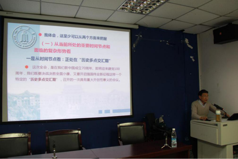 张诚教授以“党的十九届四中全会精神解读”为题,从“全会的里程碑意义、全会的主要精神、全会精神的学习贯彻”三个方面,对全会精神进行了全面系统的宣讲。
