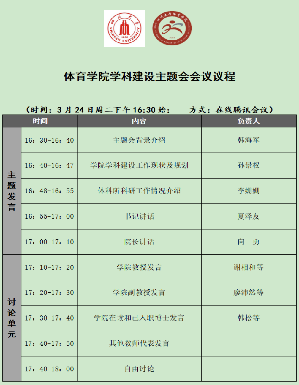 3月24日下午16:30,体育学院年度学科建设推进会正式举行。由于处在疫情防控的特殊时期,本次会议通过“腾讯会议”平台在线召开。会议由学院副院长韩海军主持,学院书记夏泽友、院长向勇、副院长邱硕立及教师代表共42人参会,具体议程安排如下。