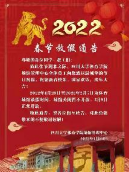 在壬寅虎年新春佳节来临之际,我校有少部分莘莘学子因做实验、考试、科研等需要,选择了寒假留校。为关心关爱这些留校学生,丰富同学们的寒假生活,由校学工部牵头多部门配合,学校已经举行和计划了一系列主题活动,包括慰问访谈、举办新春游园会、发放留校学生生活补贴、开展“一分钱”年饭活动、组织观看2022年春节联欢晚会等。体育学院在寒假期间,也积极行动,采取了全面开放体育场馆、开展趣味定向活动和跳房子、踢毽子、找福袋、射箭、攀树、滑翔伞抖伞起飞、舞龙舞狮等众多特色体育主题活动,确保了所有留校学生度过一个愉快祥和的虎年春节。