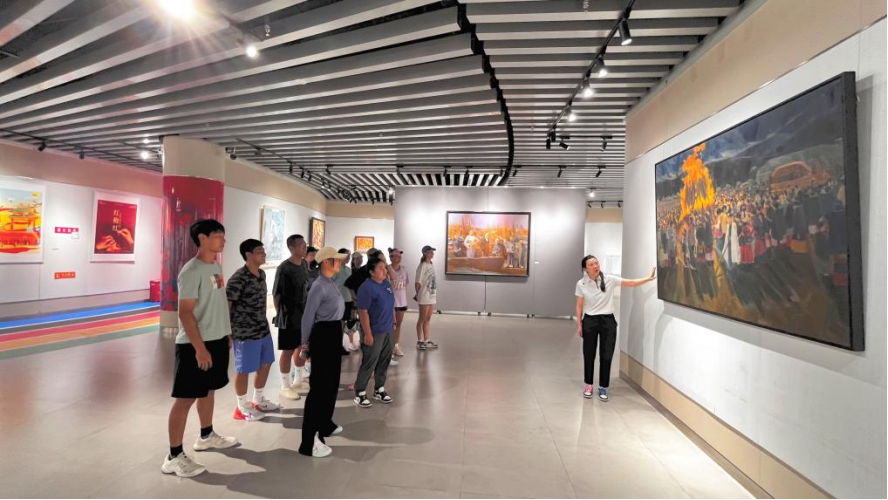 图为太阳成集团tyc122cc网球队参观“红梅红”作品展览