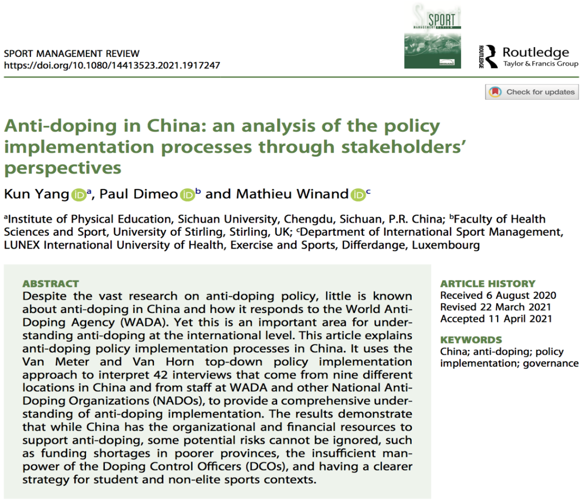 7月1日,我院青年教师杨昆博士以第一作者身份在管理学领域国际期刊(SSCI一区)“Sport Management Review”发表了题目为“Anti-doping in China: an analysis of the policy implementation processes through stakeholders’ perspective