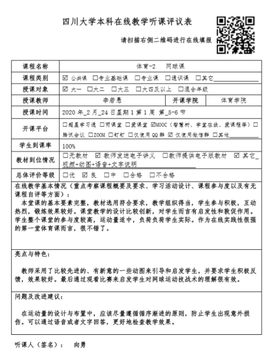 2月24日,本学期的大学体育课程正常启动,经过全体教师的努力,从第一周的教学检查结果来看情况非常好,学生到课率非常高;院领导,各教研室主任、支部书记,教学督导等全部参与了在线听课,并完成学校的在线听课评议和学院的听课评议表填写。通过收集上来的数据可以看出: