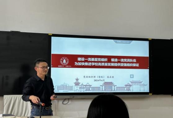 为进一步规范学院各支部党务工作、提升党务工作者业务水平,全力推进“三个一流”,建强一流基层组织,2024年4月19日,体育学院举办党务工作培训会。党总支副书记韩海军、总支宣传委员李姗姗、党政办主任陶海波、基层党支部委员和部分党员参加。校党委组织部组织科桑启源科长以“建设一流基层党组织、锻造一流党员队伍,为加快推进学校高质量发展提供坚强组织保证”为题主讲。