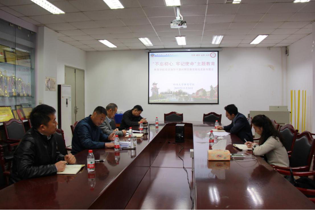 按照学校“不忘初心、牢记使命”主题教育工作部署,11月14日 下午 ,我院 领导班子 对照党章党规找差距专题会在 学院(一) 会议室召开。学校第 指导组 成员马芸同志 到会指导, 体育学院 领导班子成员参加会议 ,会议由党总支书记夏泽友同志 主持