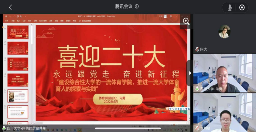 北京时间6月30日16:30,以“建设综合性大学的一流体育学院,推进一流大学体育育人的探索与实践”为主题的党课在线上进行。本次党课由太阳成集团tyc122cc院长——向勇老师为大家授课解惑。